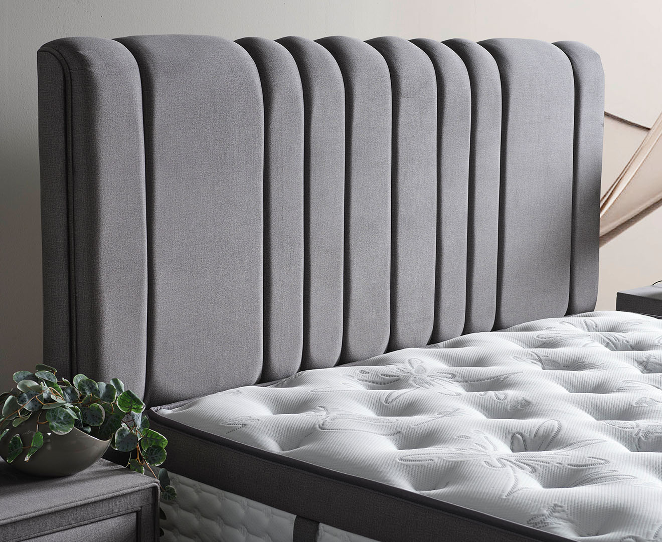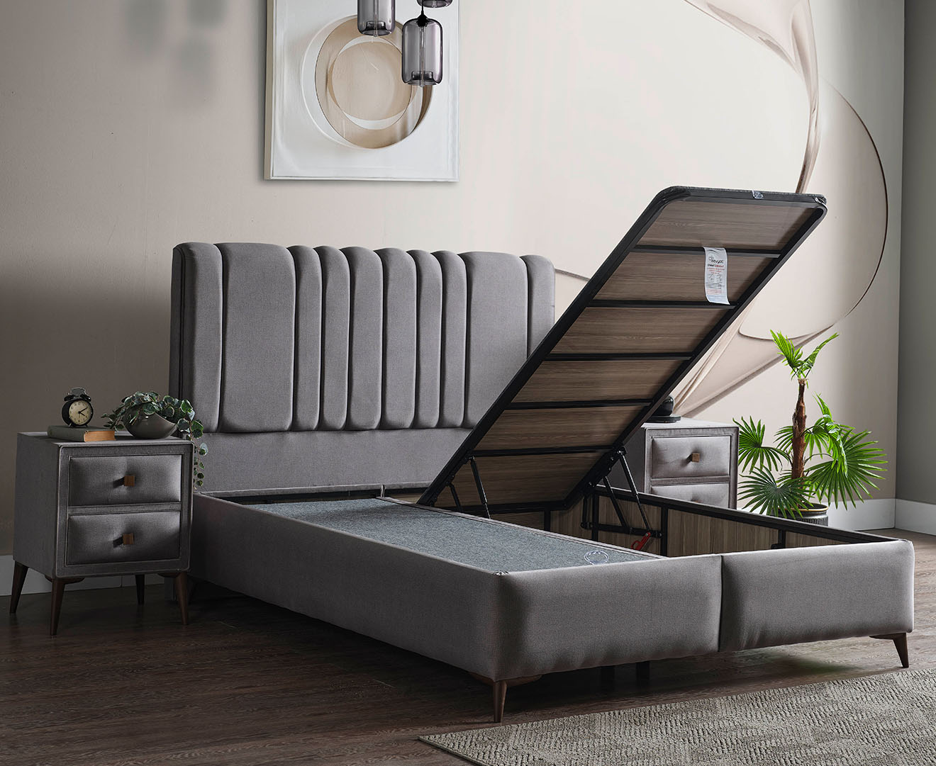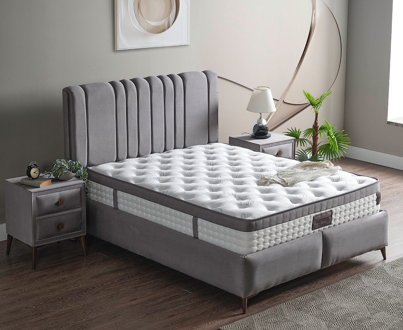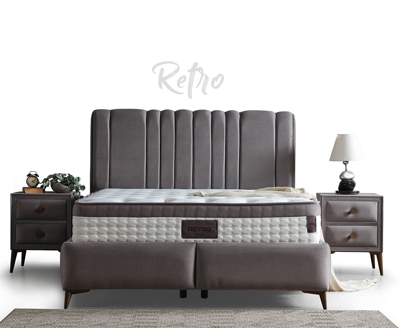 It will add a retro atmosphere to your bedroom with its retro-looking soft-textured fabric, functional nightstands and versatile base with pool system, and wooden-look legs that complement the set, adorning its simple and stylish design.